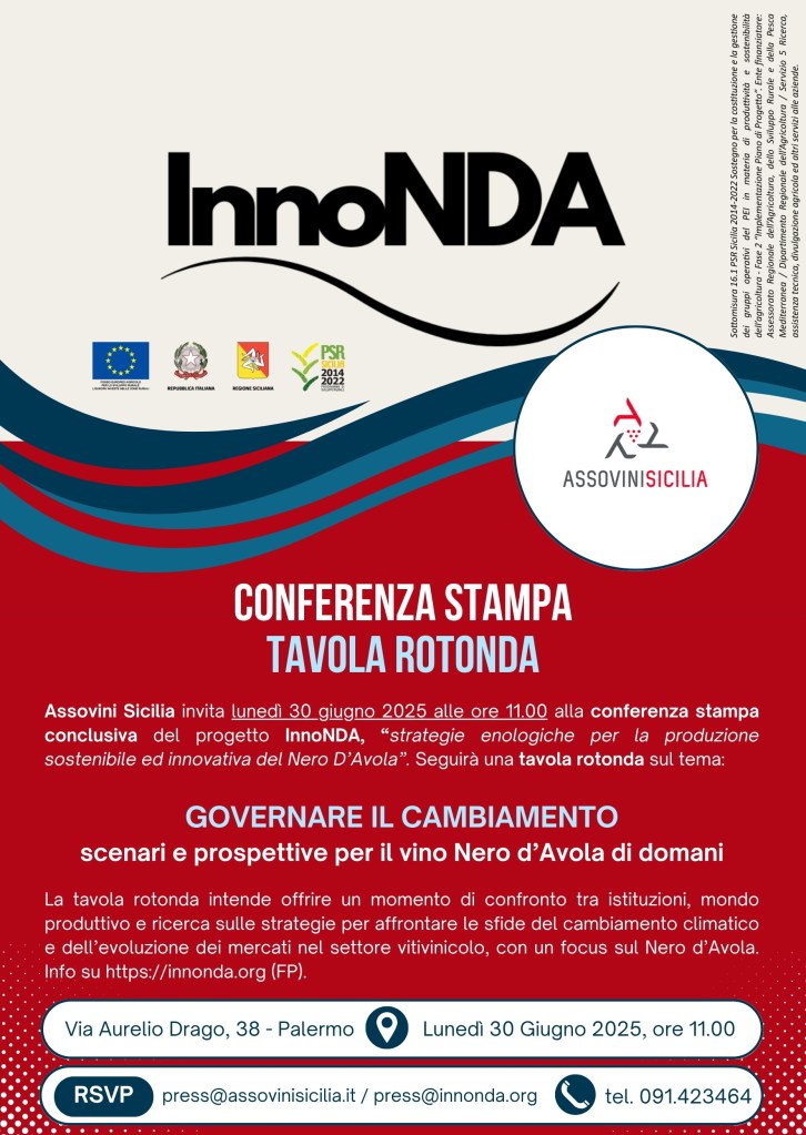 Assovini Sicilia invita lunedì 30 giugno 2025 alle ore 11.00 alla conferenza stampa conclusiva del progetto InnoNDA, “strategie enologiche per la produzione sostenibile ed innovativa del Nero D’Avola”. Seguirà una tavola rotonda sul tema: