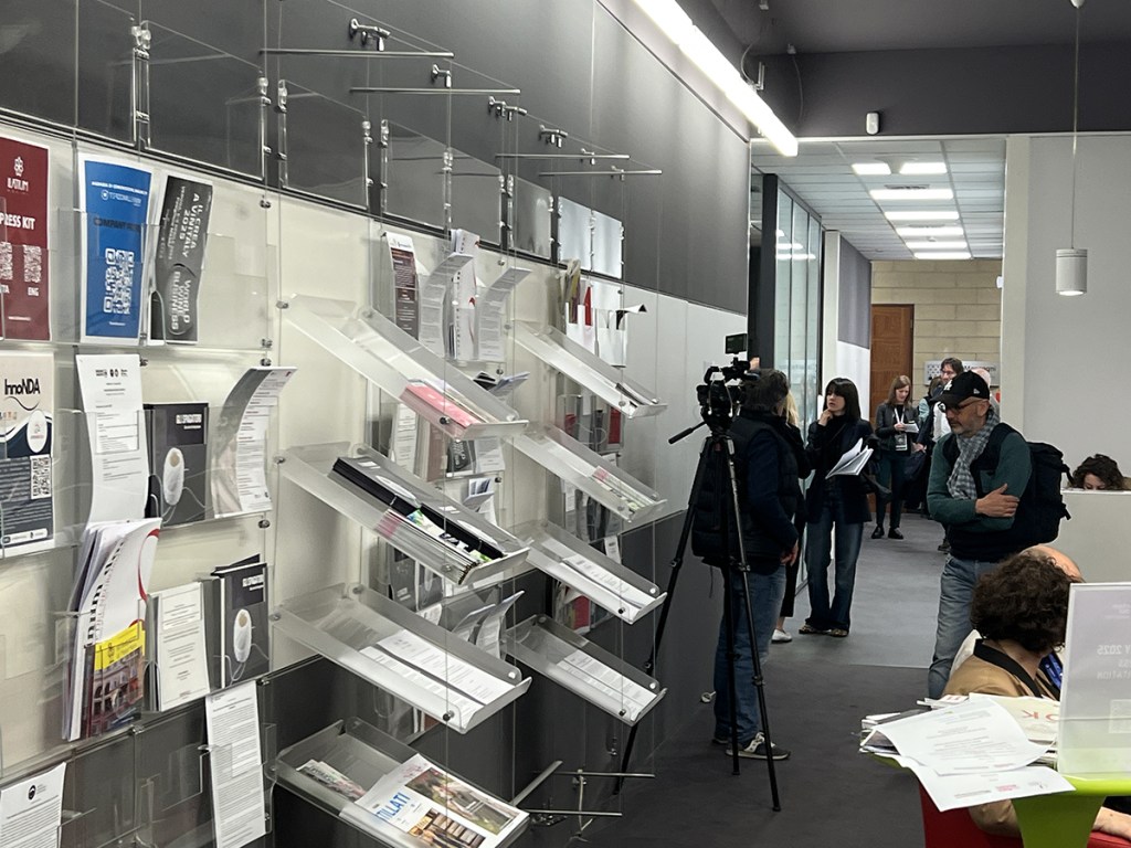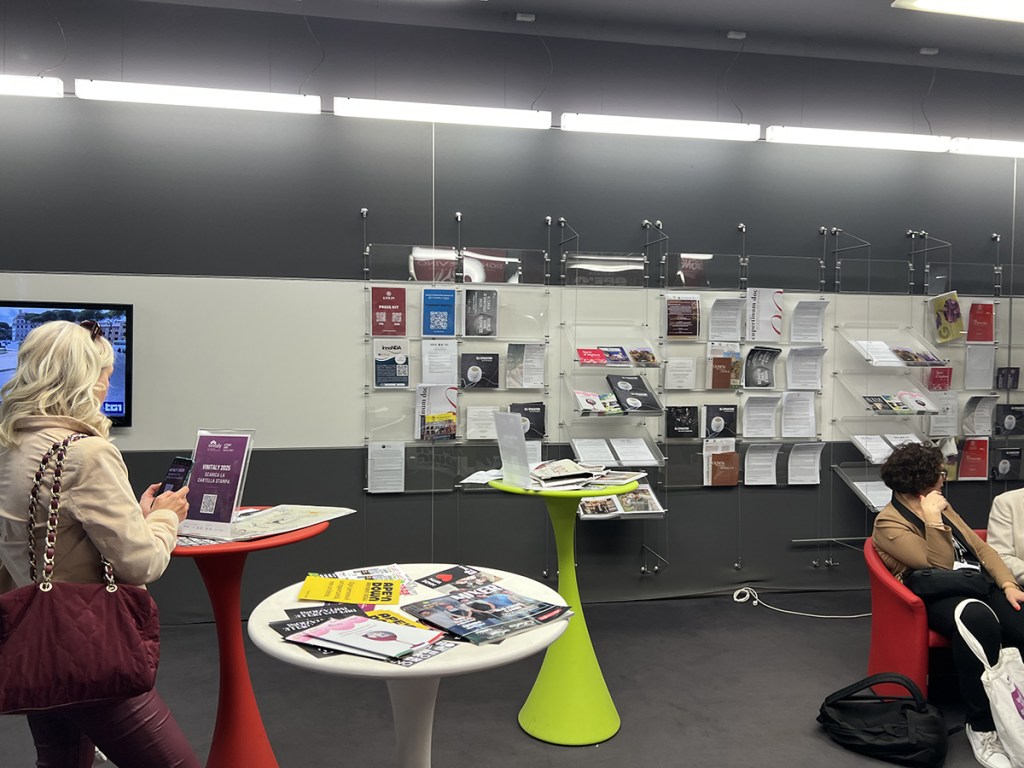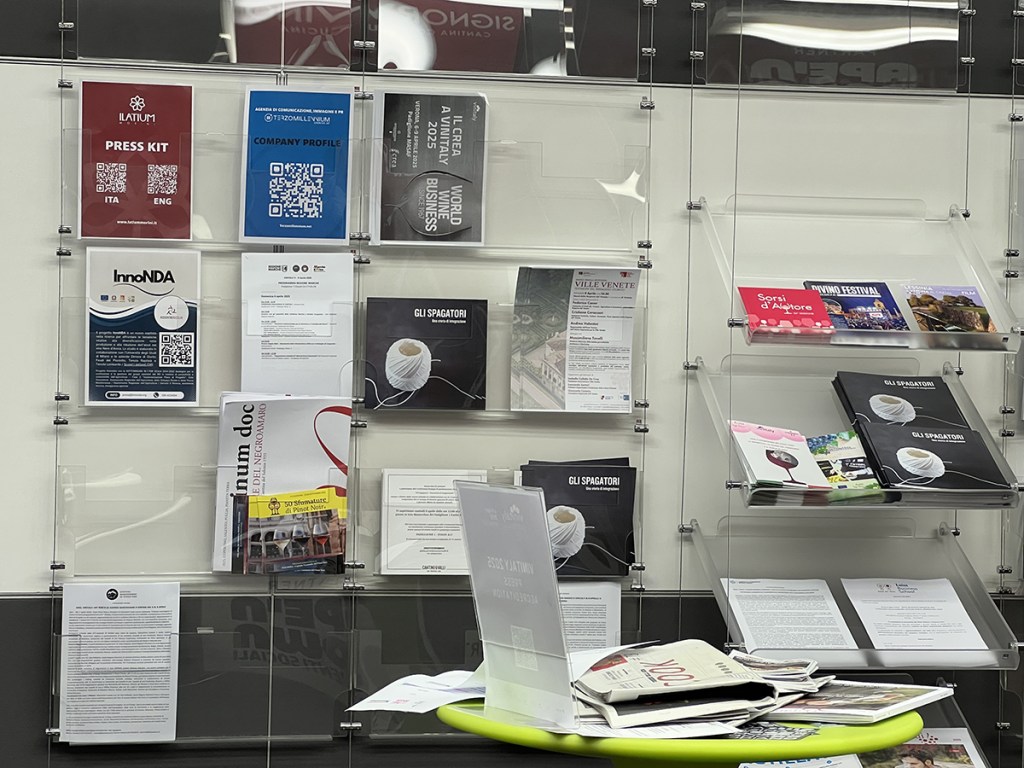 Foto del punto informativo del progetto Innonda presso lo stand di Assovini Sicilia durante il Vinitaly 2025, svoltosi dal 6 al 9 aprile. Le foto ritraggono il punto informativo allo stand e la sala stampa dove è stato possibile avere copia cartacea o scaricare il materiale tramite un QR code.